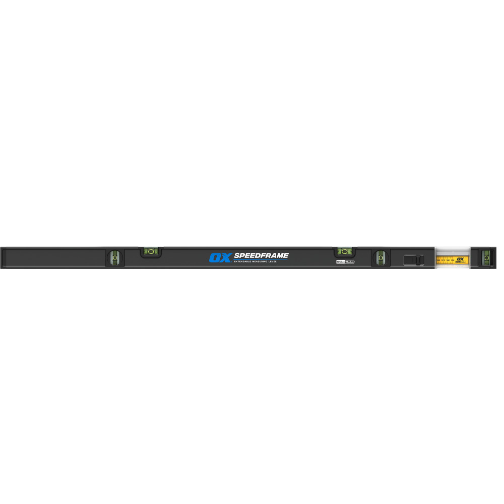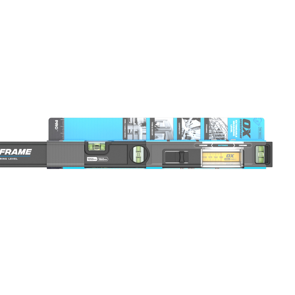 The OX PRO 1050-1860mm SPEEDFRAME is a next-gen extendable measuring tool with high-visibility measuring scale window that clearly gauges point-to-point distance measurements. Built for fast and precise point-to-point measuring, the SPEEDFRAME features a patented twin-rail extension system that smoothly extends from 1050mm to 1860mm between points, with no risk of tipping or tilting. Once the desired measurement is set, lock the extension in place with the stepless lock switch for effortless capture of the measurement. Built to overcome the frustrations of measuring with a bending tape measure, the SPEEDFRAME delivers unmatched measuring precision for framing, carpentry, window and door installs, cabinetry, pipe and, bricklaying, and much more. Equipped with five vials to facilitate more accurate level and plumb readings, durable end caps, and a 13mm hook. Machined from anodised aluminium, the CNC-milled surface brings unparalleled precision, and a continuous scribing edge allows consistent line marking even at full extension. SPEEDFRAME makes point-to-point measuring faster and rigidly accurate.