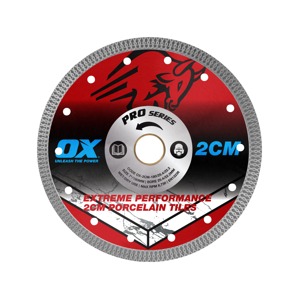 The OX Pro 2CM Porcelain Cutting Blade stands out as a specialized tool for intricate cutting of porcelain and ceramic tiles up to 20mm thick. Its mesh turbo rim and unique bond ensure precision and efficiency in tile cutting tasks.