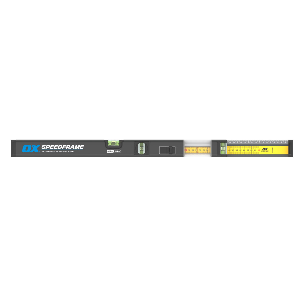 The OX PRO 600-960mm SPEEDFRAME is a next-gen extendable measuring tool designed for precise point-to-point measuring. The patented twin-rail extension smoothly extends from 600mm to 960mm with no risk of tipping or tilting. The SPEEDFRAME features an integrated scale window, three vials, built-in scribing edge, and anodised aluminium profile. Delivers unmatched measuring precision for framing, carpentry, cabinetry, pipe and cable runs, bricklaying, and much more.