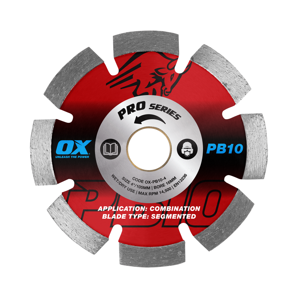 The OX Pro Segmented Combination Diamond Blade, with a diameter of 4″ (100mm) and bore size ranging from 7/8″ to 5/8″ (22mm to 15mm), is a versatile cutting tool. It’s designed for concrete products and abrasive materials like sandstone, blocks, and asphalt. Featuring 10mm flat segments and a drop segment for undercut protection, this blade is a reliable choice for various cutting tasks. It has a bore size of 16mm and a maximum RPM of 14500, ensuring efficient and precise cutting.