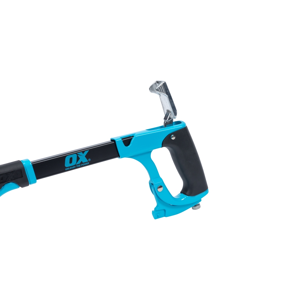 The OX Pro High Tension Hacksaw is a heavy-duty tool designed for demanding tasks. Featuring a powder-coated steel frame, it ensures durability and a prolonged lifespan. Its quick tool-less blade change mechanism allows for perfect blade tensioning. The rubber overmold handle offers an exceptional grip.