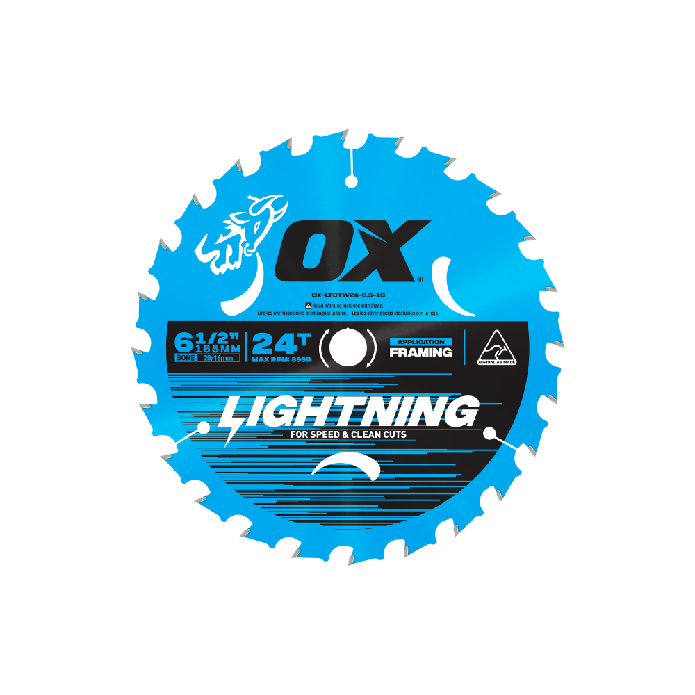 The OX Pro Lightning 165mm (6-1/4″) Circular Saw Blade is engineered for tradesmen who demand speed, precision, and durability. Featuring OXLOK® Tooth Embedded Carbide Tip technology for 30% faster cuts, an anti-friction finish, and M9-grade carbide teeth, this Australian-made blade is built for professional woodcutting applications like framing and carpentry. A true symbol of OX innovation and toughness.