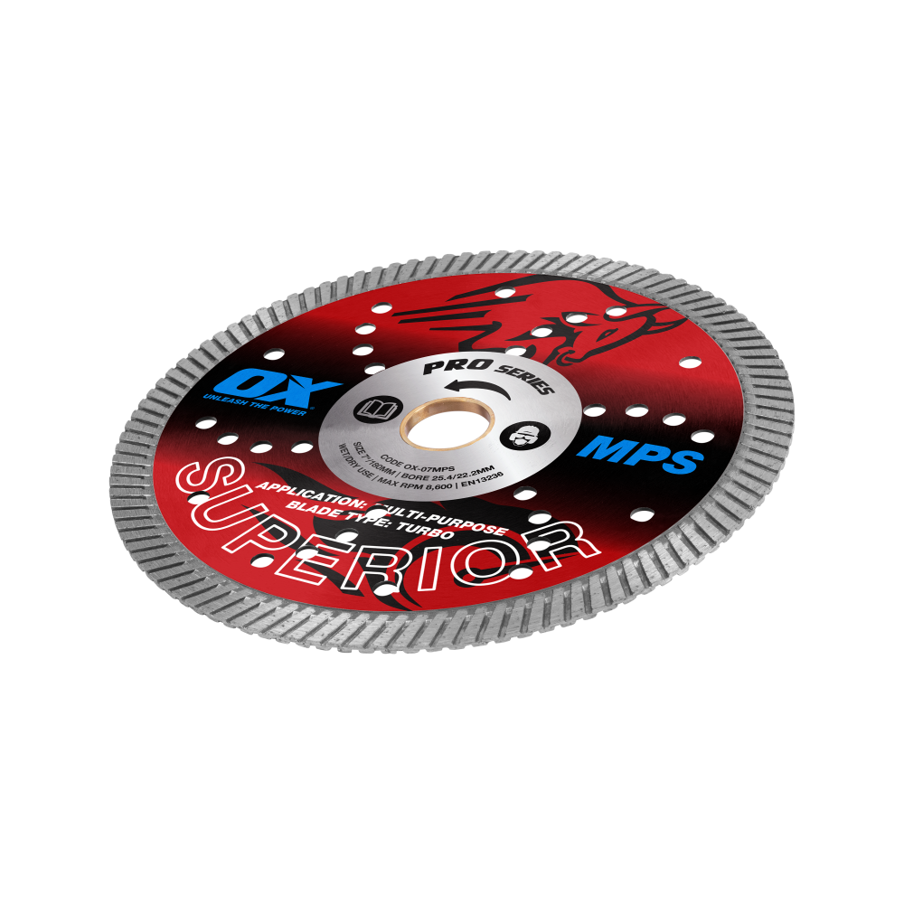 Built with the professional tradesman in mind, the OX MPS Blade series revolutionises cutting efficiency and precision with the original superior diamond blades. Designed for versatility, these blades feature a superfast turbo design that delivers aggressive, clean cuts on all construction products, making them an indispensable tool for professionals. The 12mm high segment ensures longer-lasting cutting performance, reducing the need for frequent blade replacements. Safety is paramount with the OX MPS Blade series, and the reinforced centre plate adds an extra layer of protection during operation.