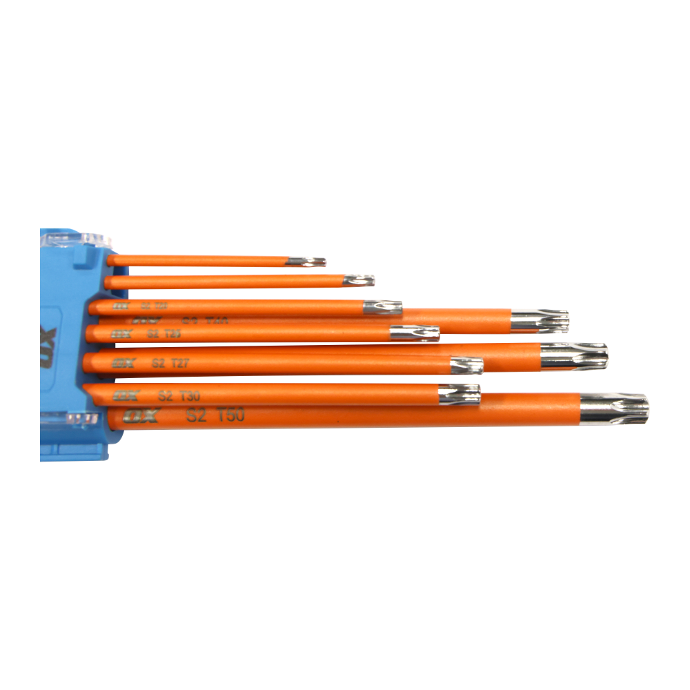 The OX Pro Tamperproof Torx Key Long 9pc Set is designed for durability and precision. Made from tough S2 steel, this set is built to withstand heavy use. Each key is coated to protect both the tools and your work surfaces. The keys are color-coded orange, adhering to industry standards, making it easy to identify as a tamperproof Torx key set. Trust OX for reliable tools that get the job done right.