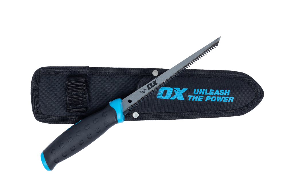 The OX Trade Jab Saw & Holster Pack offers a top-notch hardened steel blade, ensuring durability and long-lasting sharpness. With its tri-cut hardened steel blade featuring 8 teeth per inch, it delivers versatile cutting capabilities. The tool features a soft-grip ergonomic handle for comfortable use and a pointed end designed for piercing plasterboard.