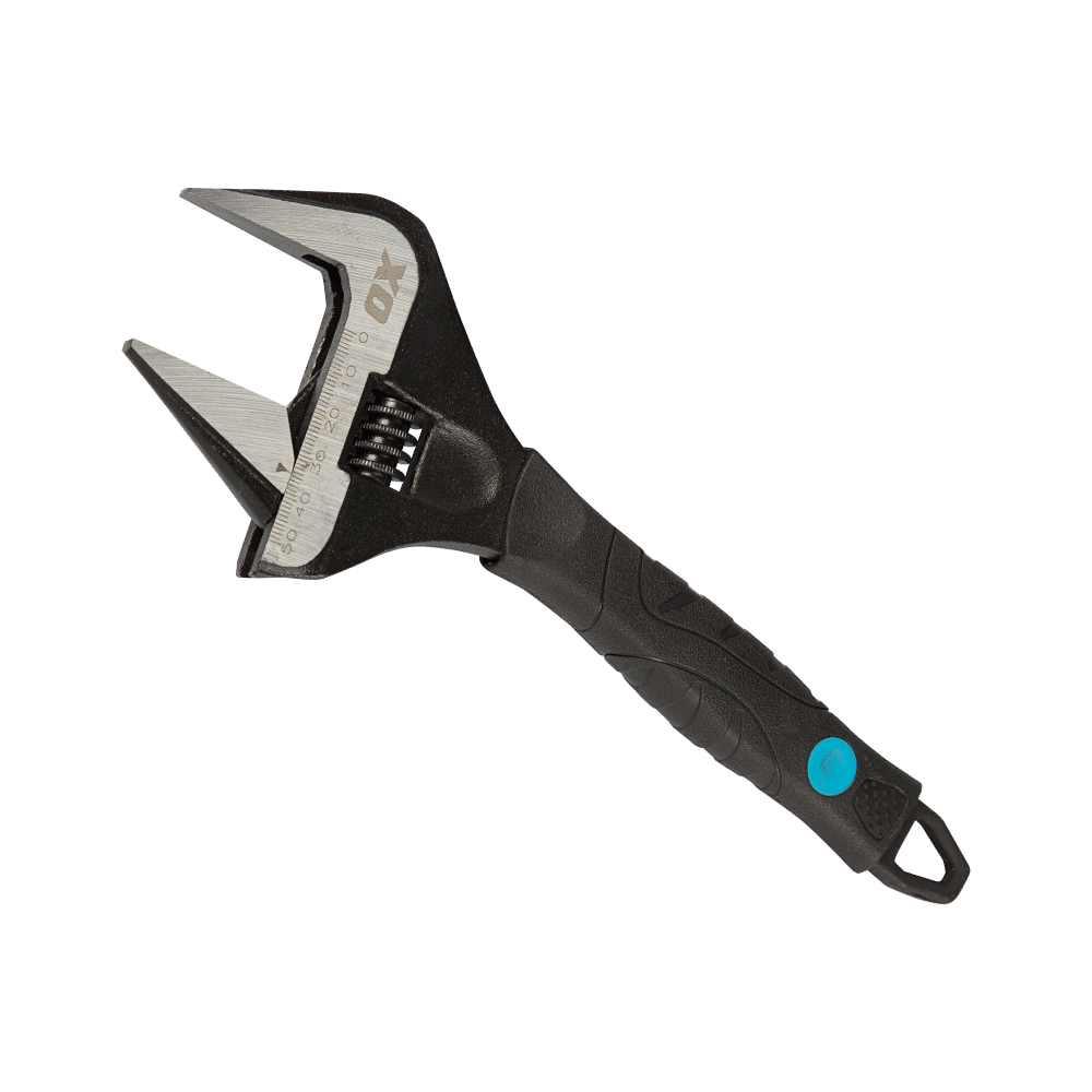 The OX Trade Ultra Wide Jaw Adjustable Wrench features an ultra-wide jaw opening and a slim head design for access to tight spaces.